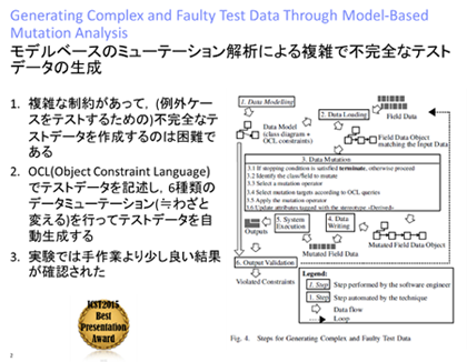 Test Analysisの論文で「Generating Complex and Faulty Test Data Through Model-Based Mutation Analysis」という論文があります。直訳すると「モデルベースのミューテーション解析による複雑で不完全なテストデータの生成」。「モデルベースのミューテーション解析」とは何か、「複雑で不完全なテストデータ」とは何か、疑問に思うはずです。この論文では、「複雑」はテストデータ間の制約が複雑ということで、「不完全」は例外条件をテストするための不完全なテストデータという意味です。この論文では、こういう複雑で不完全なテストデータを作成するのは困難であるという課題を設定しています。この課題に対して、OCL(Object Constraint Language)という言語でデータ間の制約をモデルベースで記述し、データをわざと変えるデータミューテーションを利用してテストデータを作成するという解決アプローチを採っています。